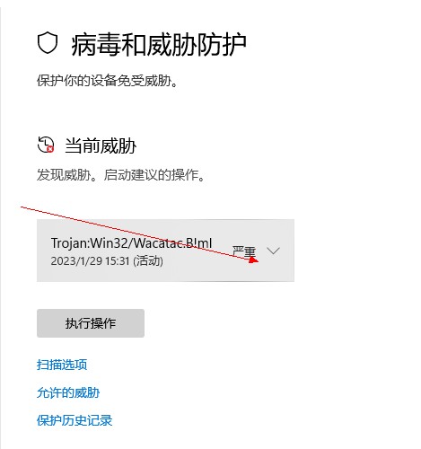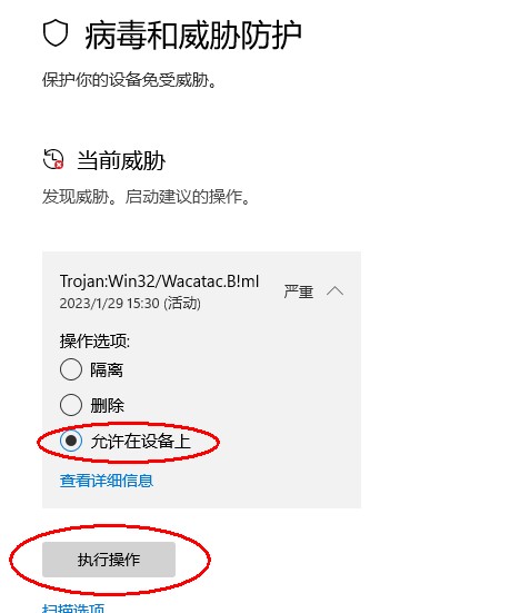 2、单击上图中“严重”后面的下拉,打开威胁详情,见下图,选中“允许在设备上”点执行操作。